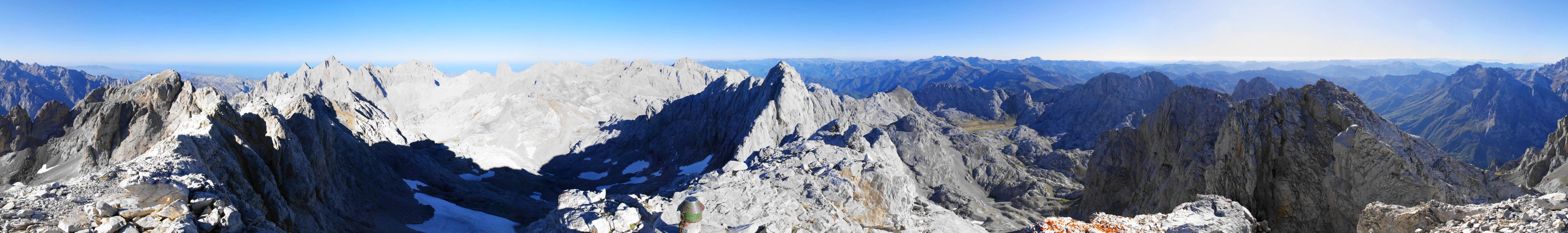 La cima es bastante reducida y las rachas de viento, importantes. Aún así y sujetándome al vértice geodésico, por si las moscas, no quise abandonar sin hacer una panorámica. Una pena el viento y no poder estar tranquilo para hacer algo más decente, pues no se veía ni una nube en lo que alcanzaba la vista: