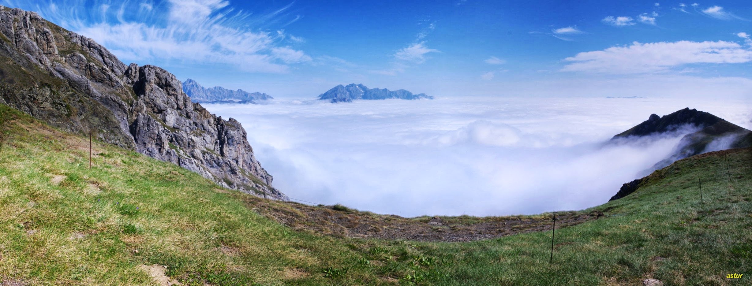 Y ya desde la cima, disfrutamos de unas vistas que con ese "mar" de niebla no tengo claro si las realza o lo que hace realmente es impedir ver mejores panoramas. A propósito, hice un par de panorámicas y no se el motivo (era la primera vez que hacía las fotos en vertical), que no encontré programa capaz de "construir" una mínimamente presentable. Incluido Autopano: